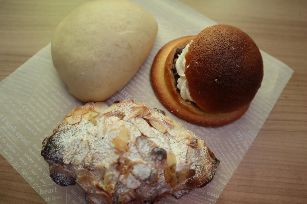 焼きカレーパンと金時パンとアマンド・ショコラです。白いパンは、焼きカレーパンです。揚げてないので最後まで美味しく食べれます。
